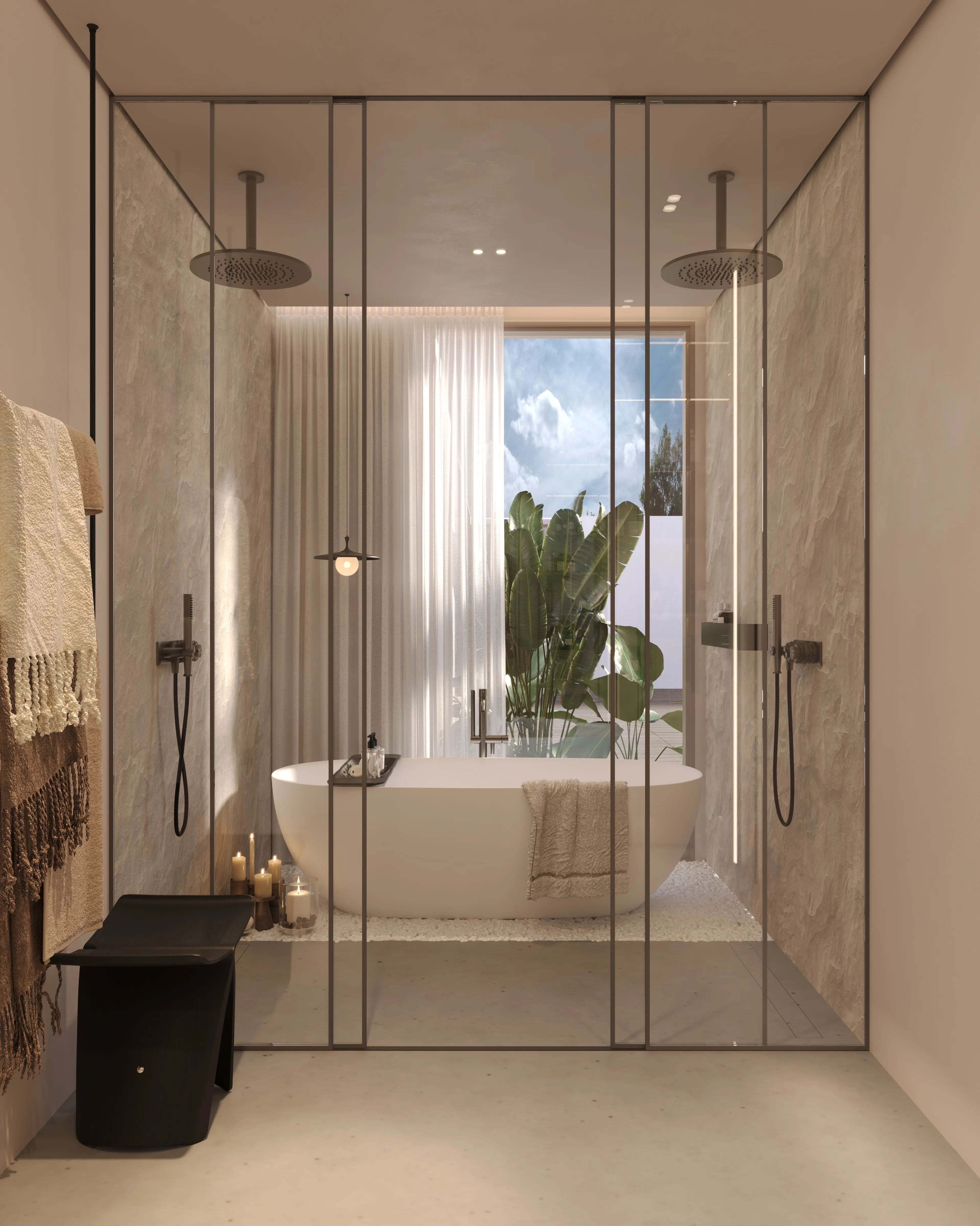 O interior da D'Monte House vive num equilíbrio delicado entre sofisticação e conforto. O microcimento percorre toda a casa, criando continuidade visual e uma base neutra para a serenidade do espaço. As madeiras claras aquecem o ambiente, tornando-o acolhedor e subtilmente envolvente. Cada janela é um convite ao exterior, à natureza, à luz, ao silêncio. Nesta casa, tudo comunica entre si. E tudo convida a ficar.
