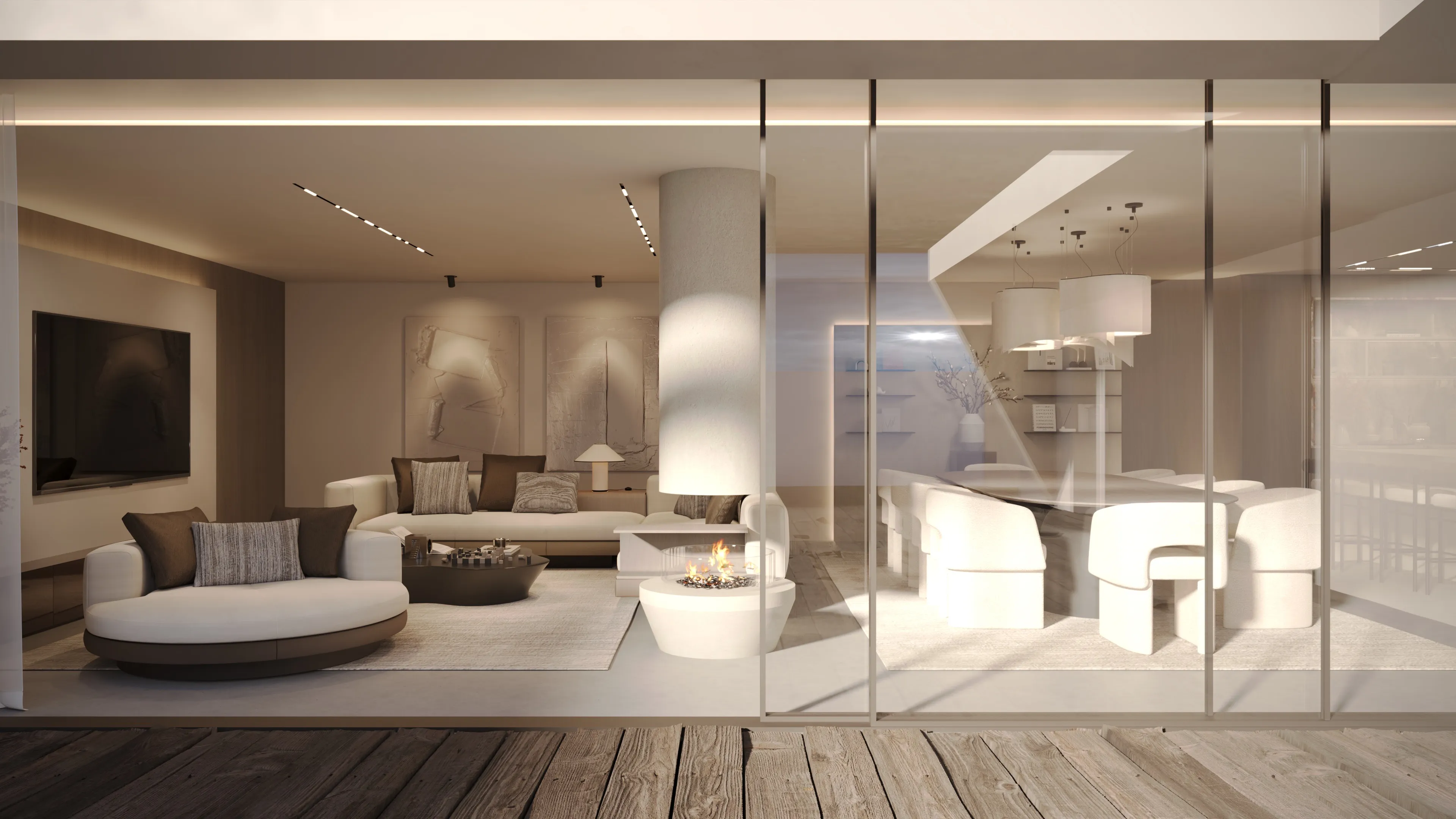 Entre o interior e o exterior, tudo foi pensado ao detalhe: da sala de cinema integrada ao mobiliário desenhado à medida, da piscina ao pitfire e à zona de refeições. Uma casa térrea onde cada escolha reflete conforto, intenção e um equilíbrio subtil entre funcionalidade e sofisticação.