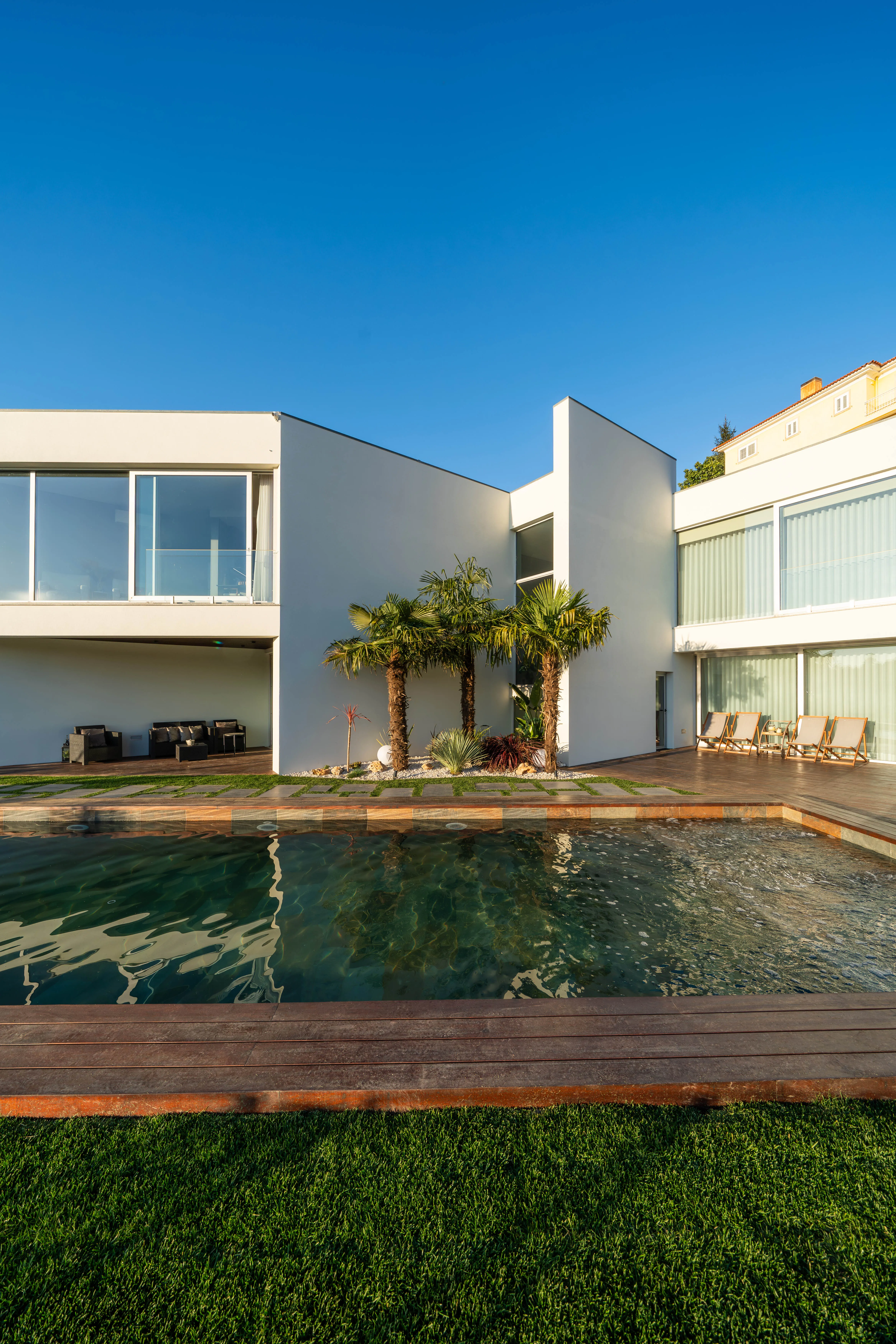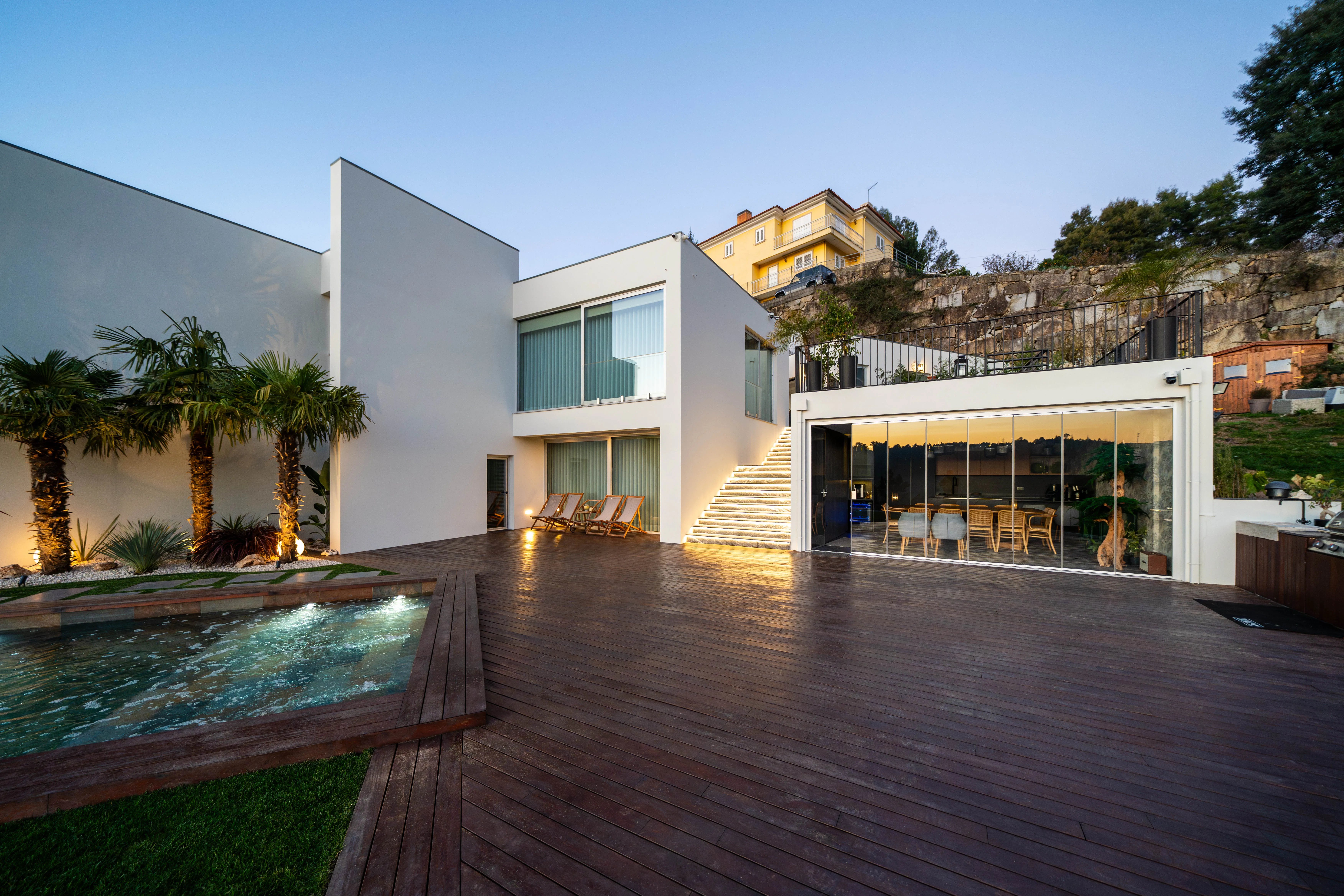 A entrada principal, a escadaria exterior, a piscina longitudinal e a zona de estar protegida ampliam a experiência sensorial. Cada detalhe é resolvido com precisão, equilibrando função e estética.