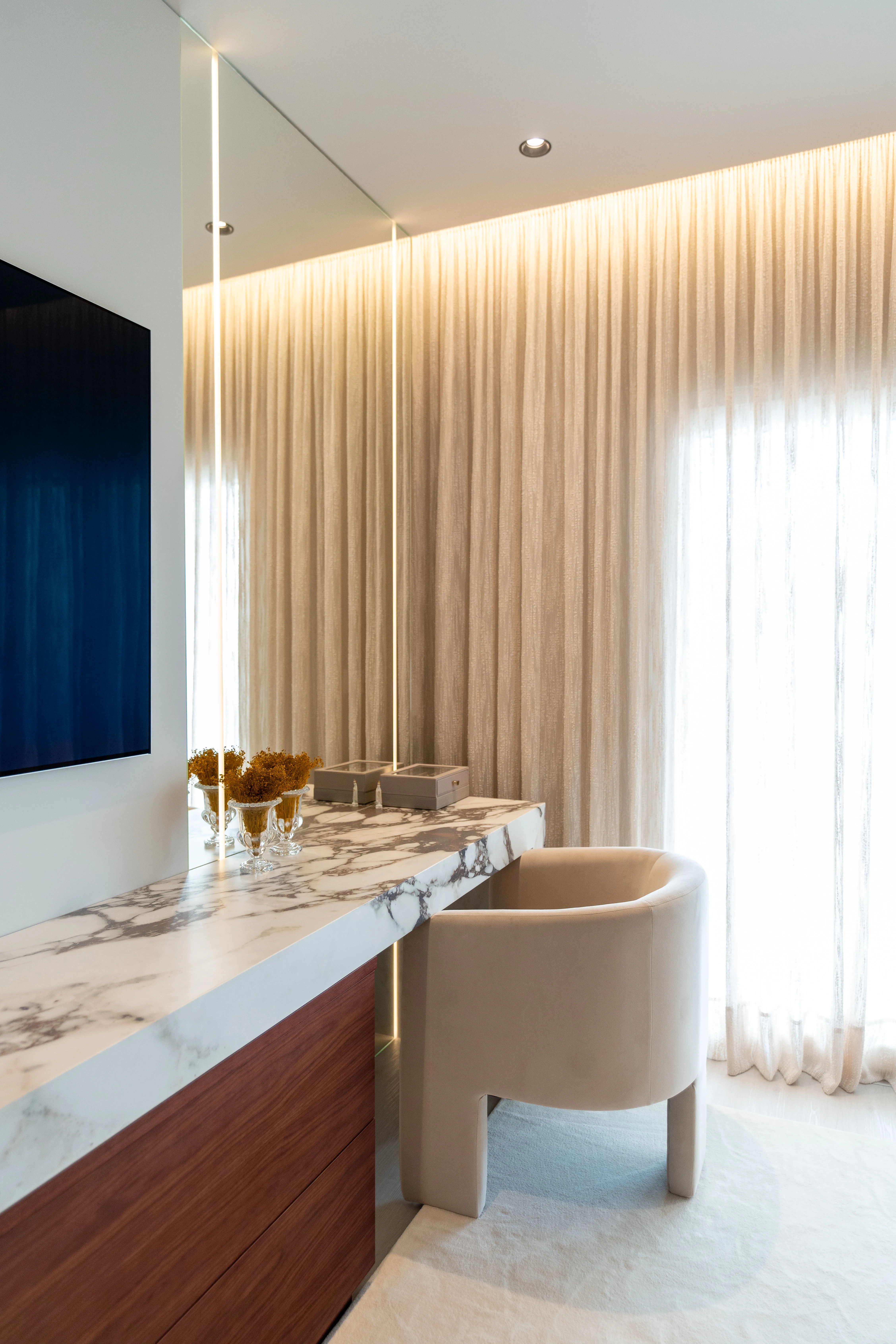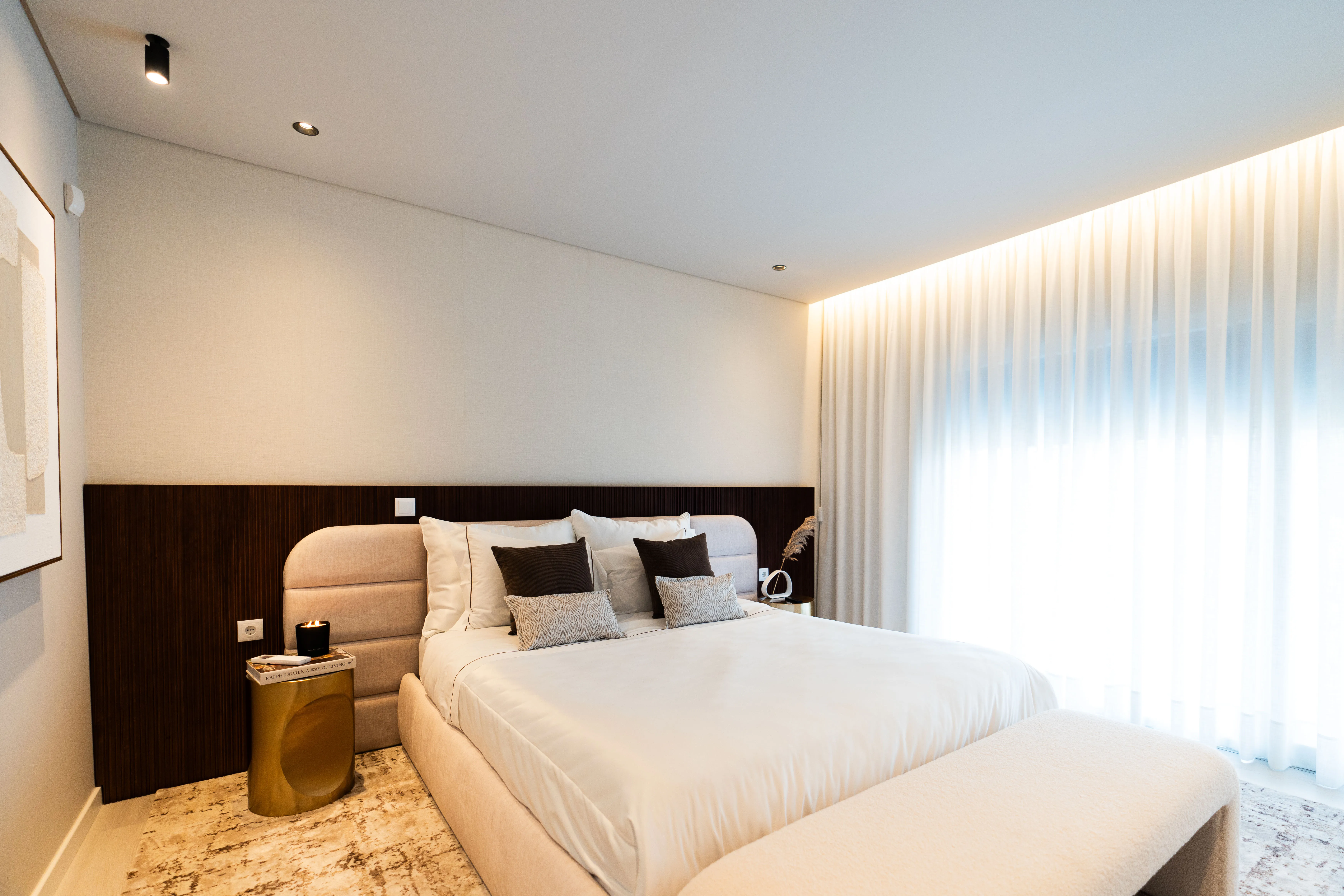 Cada área foi cuidadosamente estruturada para responder a uma vivência prática, sem nunca abdicar da sofisticação. Um interior onde a decoração trabalha texturas suaves, tons neutros e peças de mobiliário desenhados à medida, introduzem leveza ao espaço e reforçam, também, a identidade do projeto.