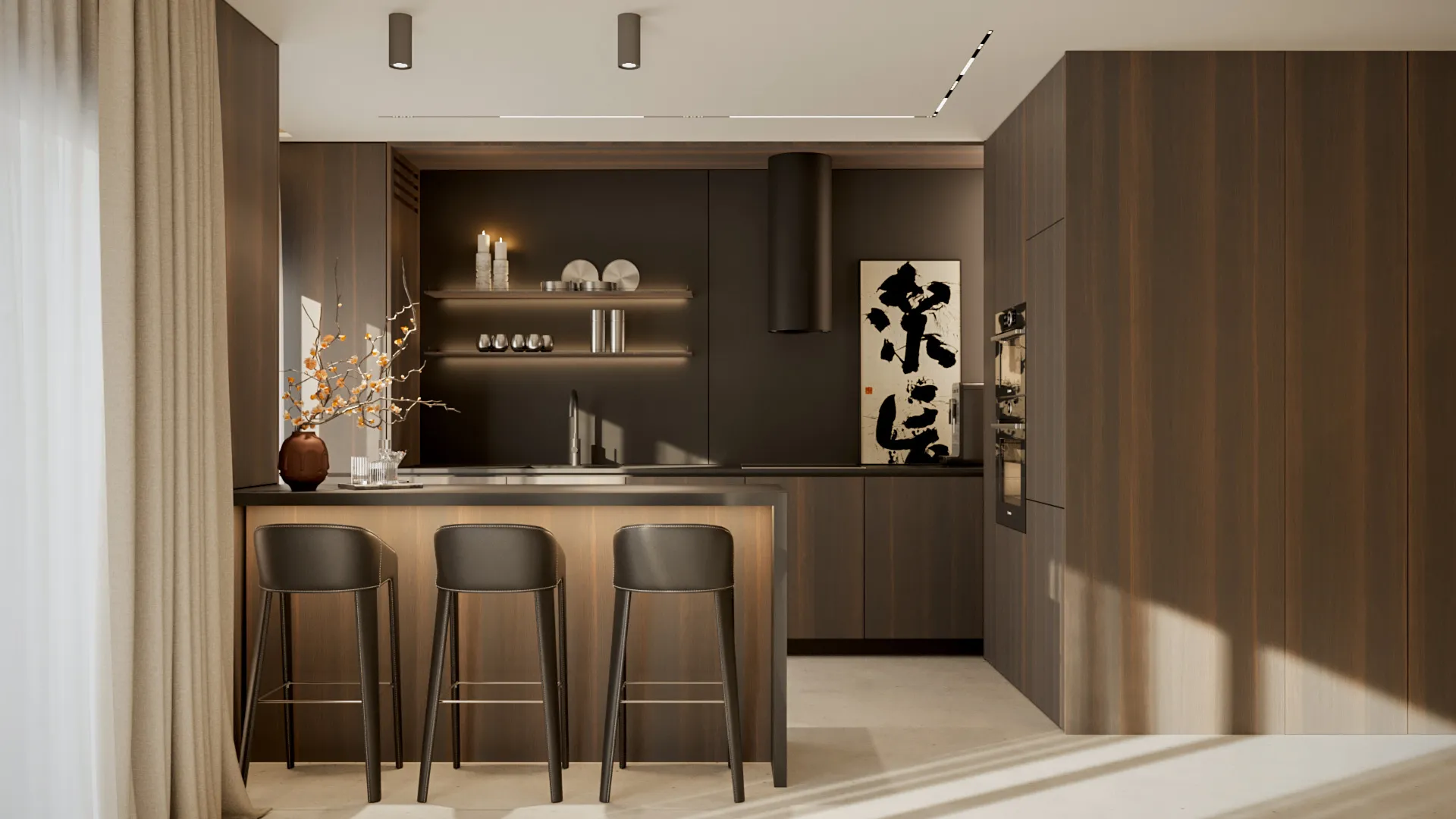 O projeto foi trabalhado com rigor, privilegiando uma paleta escura, com tons de castanho e envolvente, enquanto as madeiras profundas e os materiais naturais como a pedra e o ferro oxidado conferem ao apartamento carácter e subtileza.
