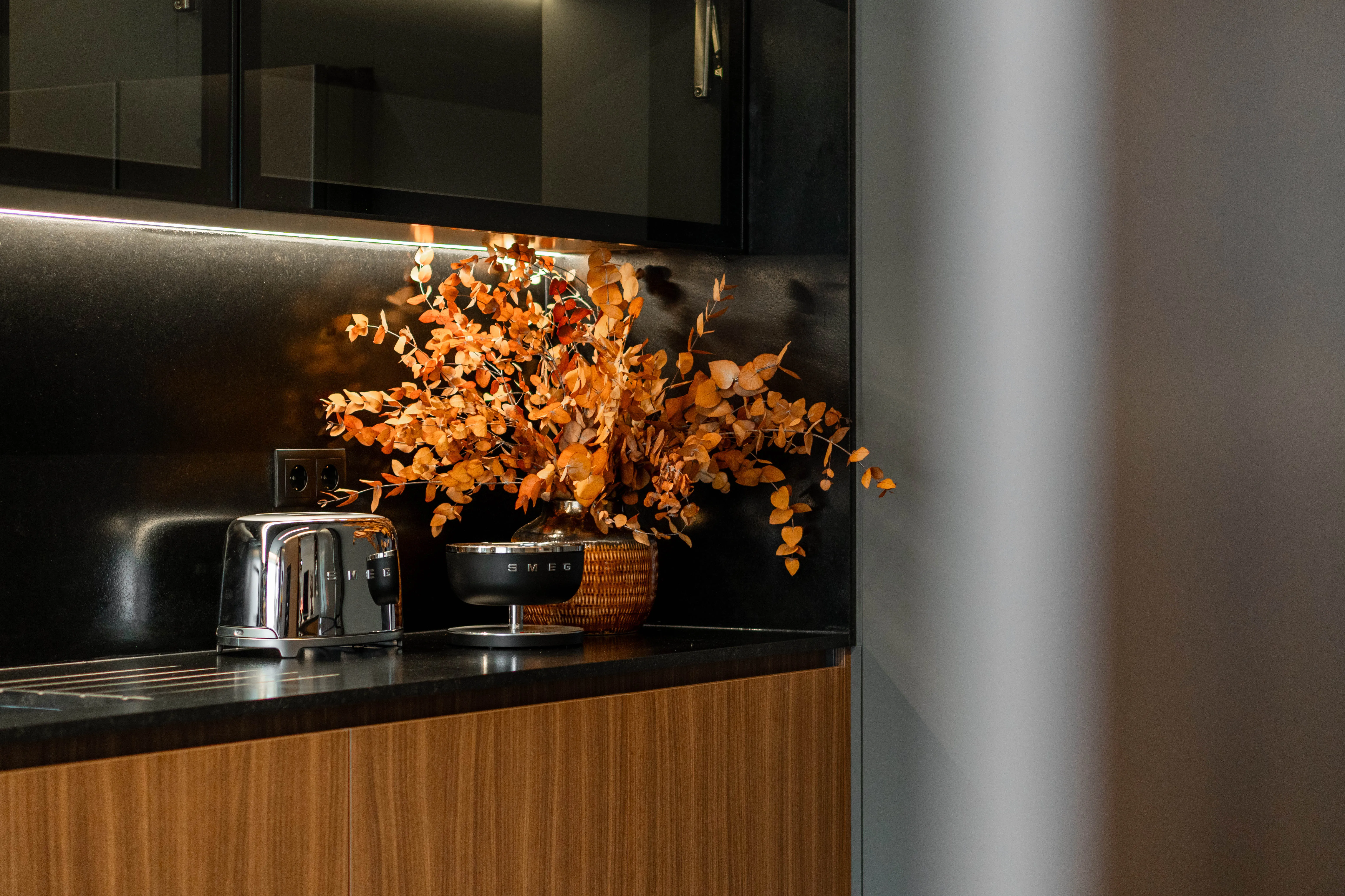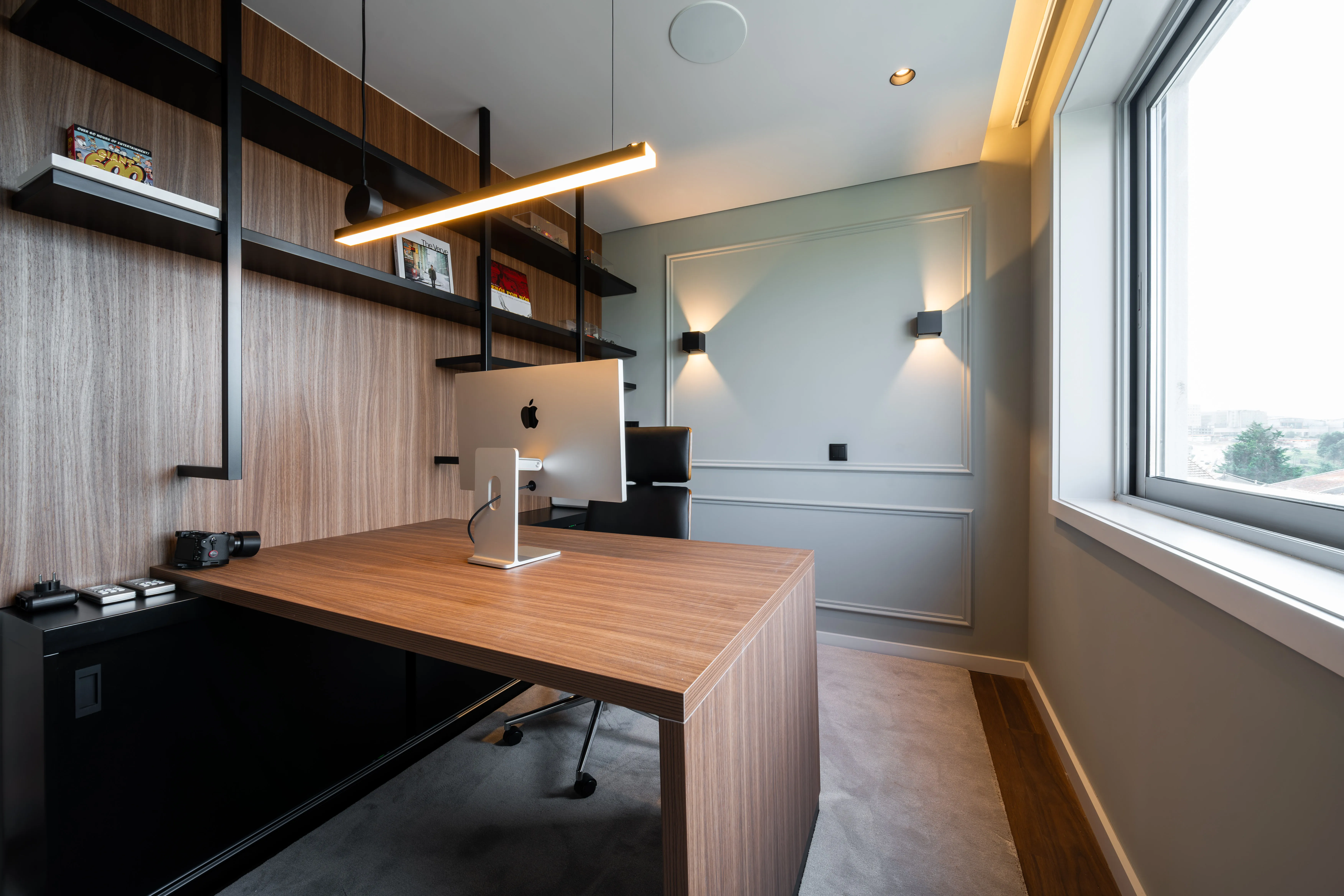 O projeto desenvolve-se num estilo coeso e intencional, com mobiliário e peças decorativas desenhadas à medida, focados na estética e no conforto.