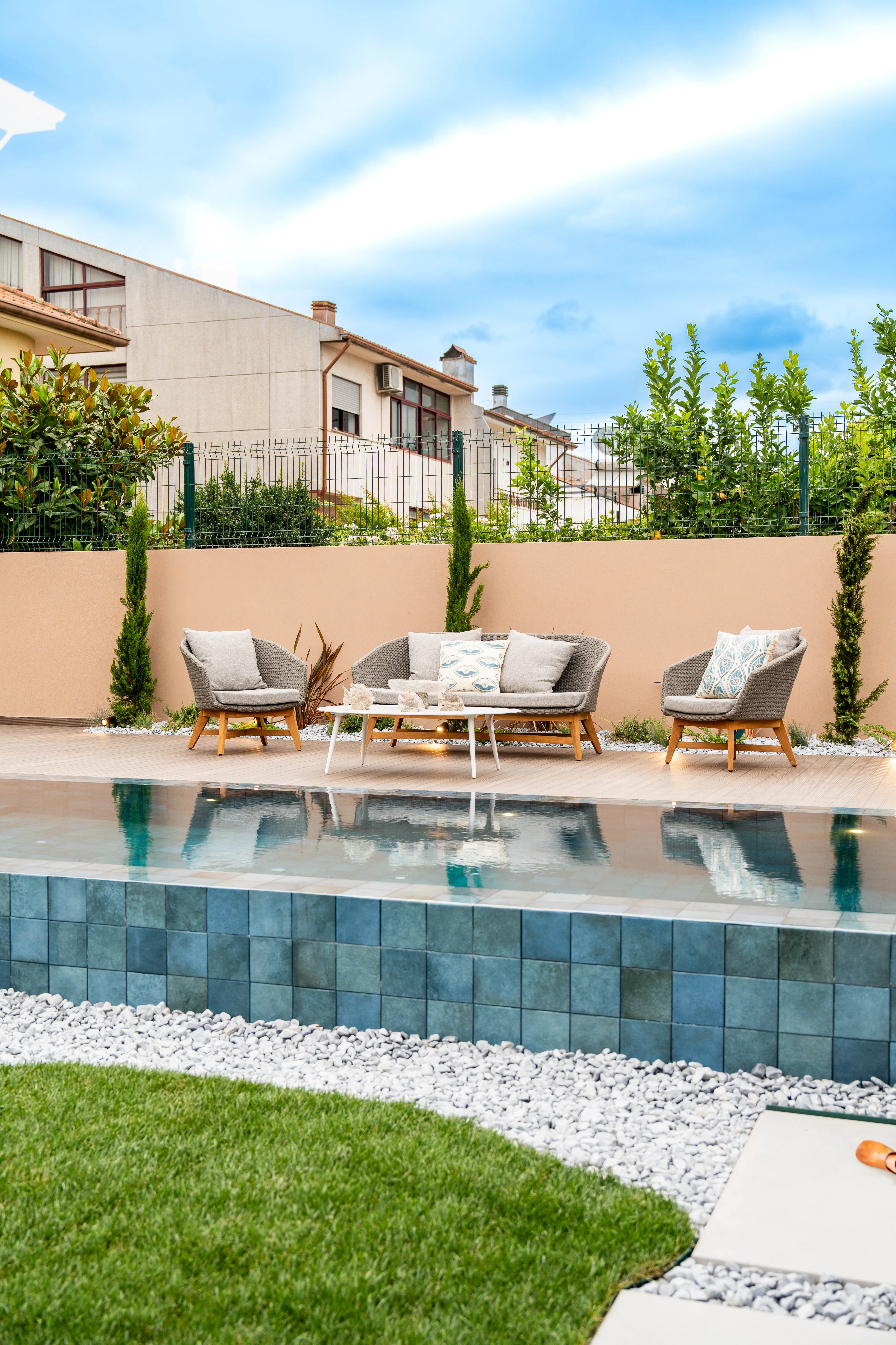 O jardim integra uma zona lounge, um espaço de refeições com churrasqueira e uma piscina infinita embutida no deck em madeira ligeiramente elevada, que ganha protagonismo.